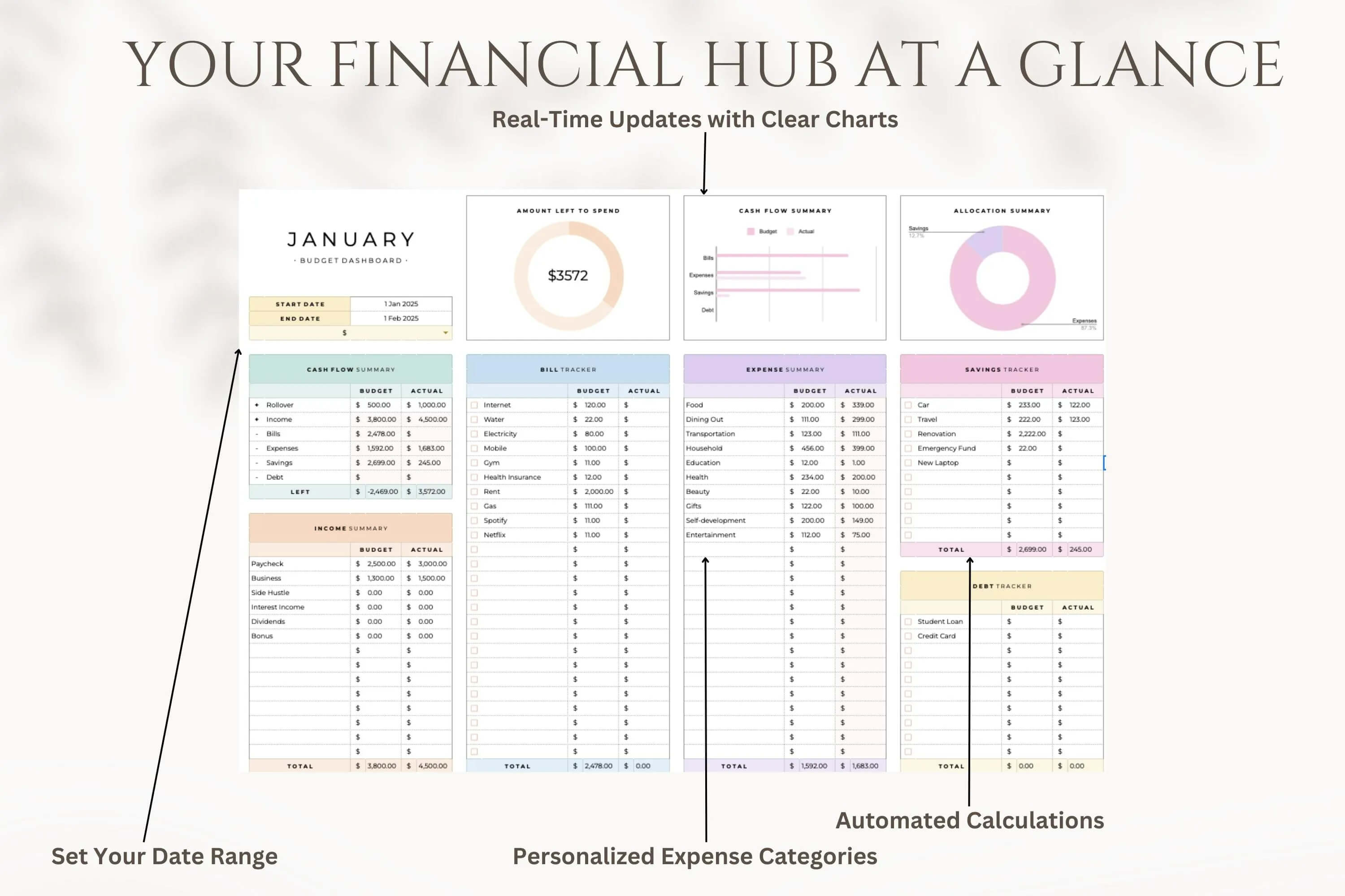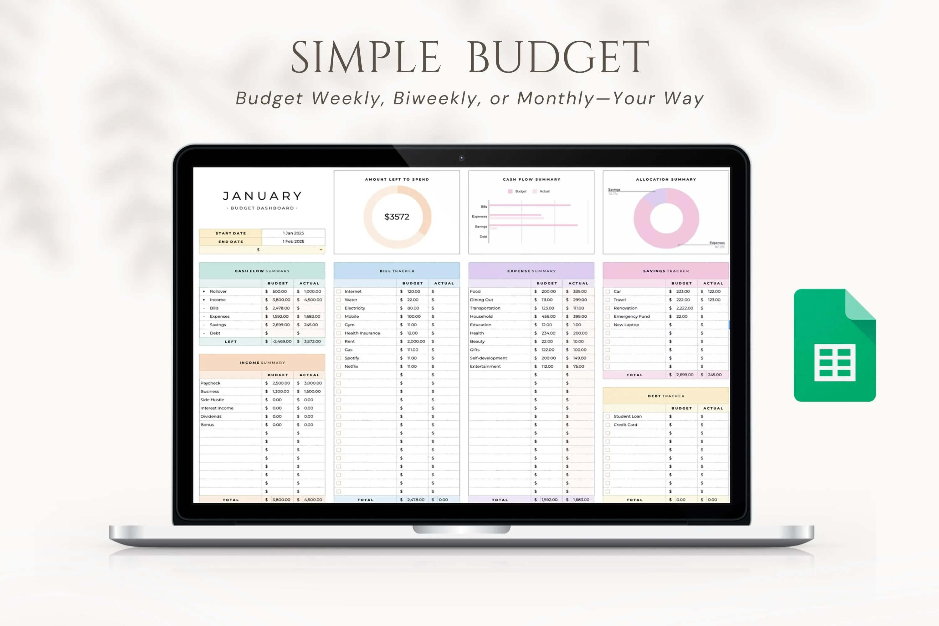 Track spending, bills, and savings in one simple Google Sheet.
